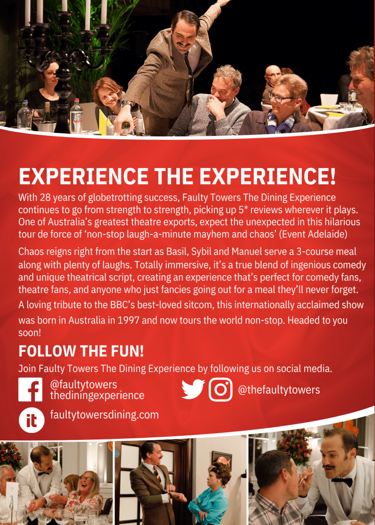 The world-renowned immersive phenomenon is currently celebrating its twenty-fifth anniversary as the world’s most sought-after tribute to the BBC sitcom. Faulty Towers The Dining Experience is an unmissable highly interactive comedy spectacular, where audiences enjoy a 3-course meal alongside 5-star comedy.